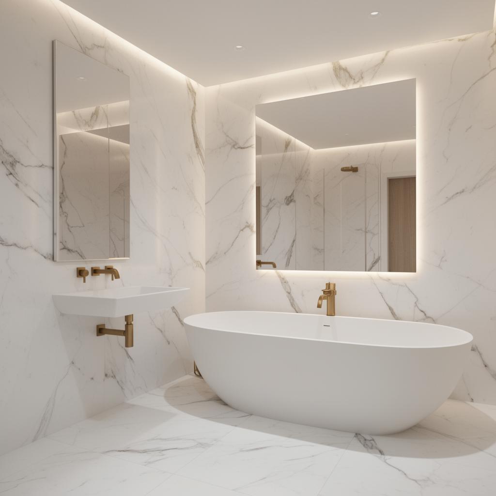 Salle de bain entièrement habillée de marbre Calacatta, baignoire îlot et robinetterie en laiton brossé sur-mesure.